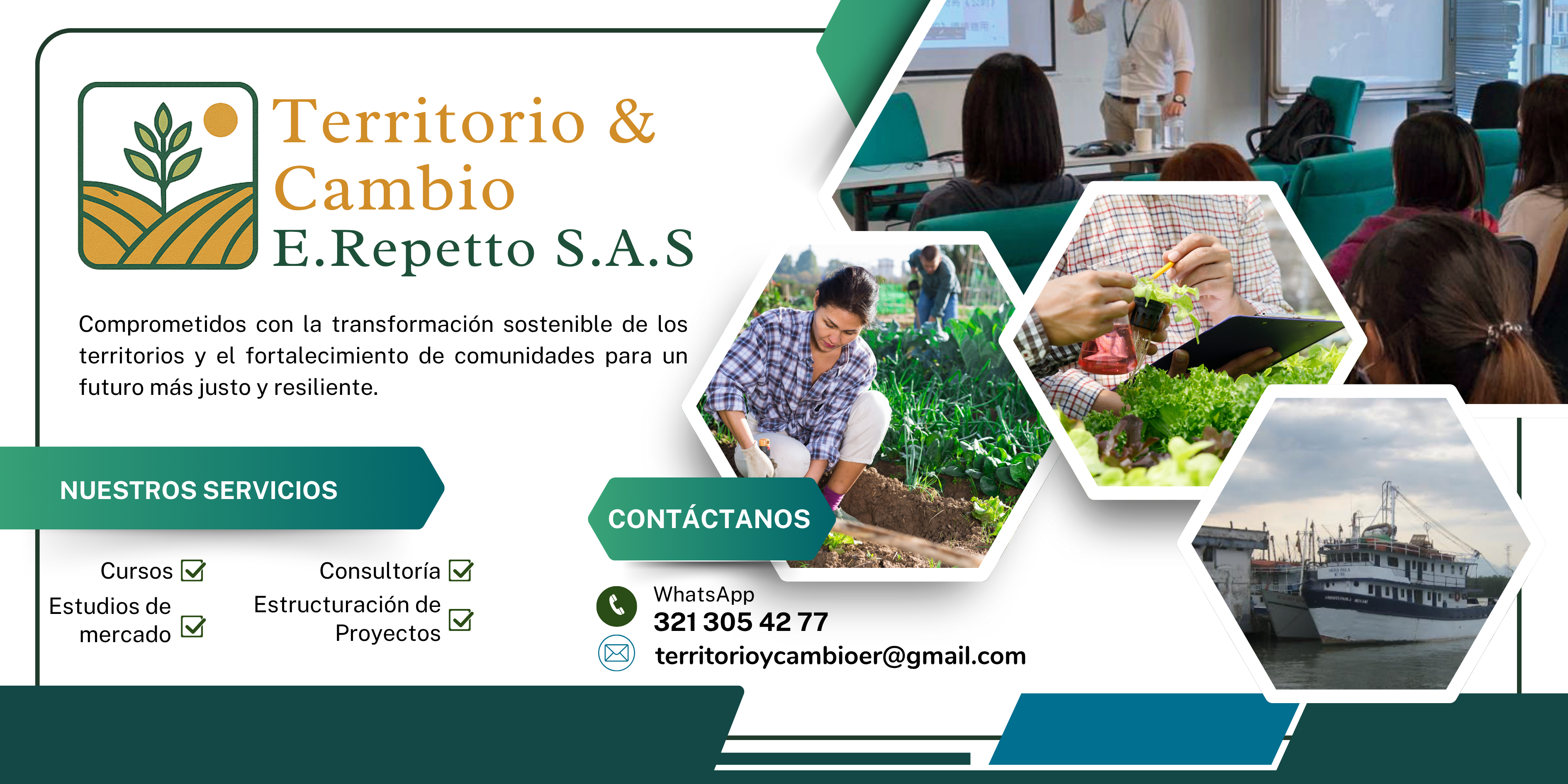 Territorio & Cambio E.Repetto S.A.S. cuenta con un equipo de consultores expertos que están en capacidad de adelantar estudios de los mercados nacional e internacional de los distintos productos agropecuarios y de acompañar a las organizaciones de productores a transitar la ruta que les permite acceder a los dichos mercados mercados.